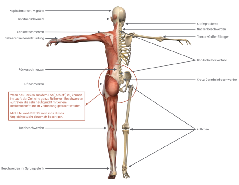 Dadurch können die Nervenwurzeln entlang des Rückenmarks gereizt und bedrängt werden. Die Verschiebung des gewichttragenden Iliosakralgelenks hat zur Folge, dass sich Schultergürtel und Kopf wechselseitig verdrehen. Ebenso wird das Gleichgewicht anderer tragender Gelenke, wie zum Beispiel Knie-, Knöchel- und Fußgewölbe empfindlich gestört.